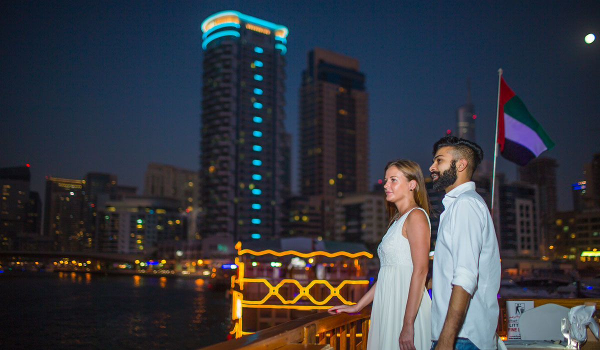 cruises past glittering buildings and the beautifully lit up Dubai Marina.
